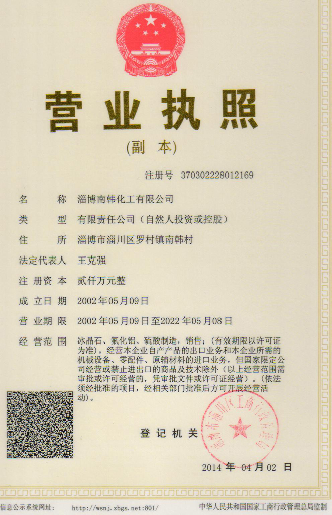 淄博南韓化工有限公司位于淄博市淄川區(qū)羅村鎮(zhèn)南韓村,注冊(cè)資本為2000萬(wàn)元,始建于1995年,原名為淄川區(qū)南韓社會(huì)福利化工廠,2002年改制成淄博南韓化工有限公司,占地面積為23000平方米,現(xiàn)有職工300余人,各類工程技術(shù)管理人員80余人。目前主要從事氟化鋁、擬薄水鋁石的生產(chǎn)和銷售。 公司工藝完善,技術(shù)力量雄厚,氟化鹽和擬薄水鋁石系列產(chǎn)品各項(xiàng)指標(biāo)均達(dá)到標(biāo)準(zhǔn)。國(guó)內(nèi)用戶遍布20多個(gè)省市和地區(qū),并出口美國(guó)、韓國(guó)、日本、東南亞等國(guó)。 公司以科學(xué)的管理,致力于構(gòu)建節(jié)能、安全、環(huán)保企業(yè)文化,以穩(wěn)定的質(zhì)量、完善的服務(wù)、合理的價(jià)格贏得客戶的信賴,董事長(zhǎng)王克強(qiáng)先生愿與各界同仁共創(chuàng)美好的未來(lái)!