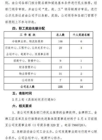 山東中凱興業(yè)貿(mào)易廣場有限公司工會2017年4月28日發(fā)布通知,擬對“中凱興業(yè)勞動獎集體”和“金牌職工”進行表彰,通知全文如下: