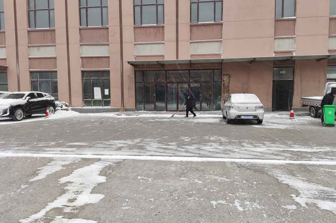 由于降雪較大,地面的積雪厚厚一層,只能鏟雪板先行,再用掃帚和鐵鍬跟進(jìn),經(jīng)過數(shù)小時的奮戰(zhàn),終于將園區(qū)的西門、北門、主干道、地下停車場入口、商務(wù)樓、一號冷鏈南門等路段的積雪清除完畢,最大