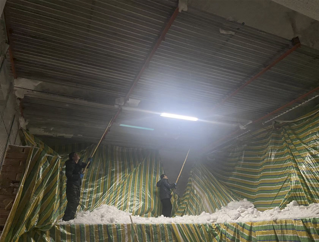 除冰、除霜工作開始前,設(shè)備人員對冷庫設(shè)備進(jìn)行全面檢查,設(shè)置警示標(biāo)志,確保除冰、除霜設(shè)備運(yùn)轉(zhuǎn)正常及作業(yè)人員的人身安全。除霜工作系低溫作業(yè),雖然面臨著手僵直、拿不穩(wěn)、冰面滑、站不穩(wěn)等困難,但是中凱作業(yè)員工一干就是6、7個(gè)小時(shí)。