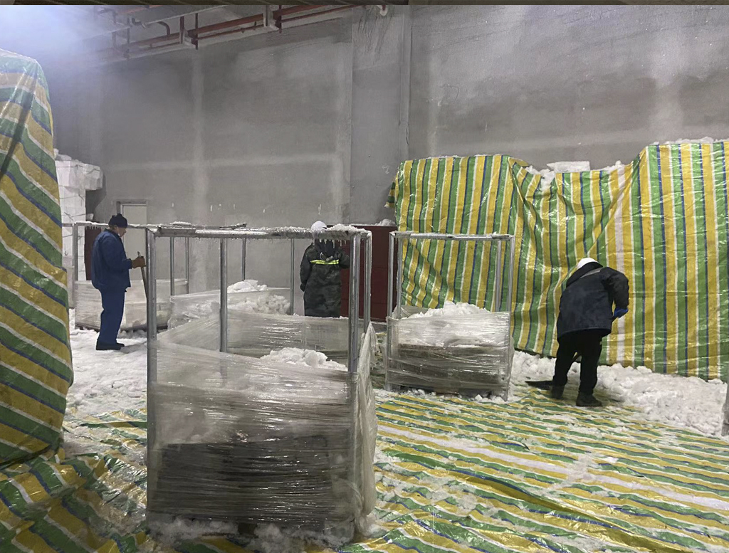 中凱智慧冷鏈物流園內(nèi)中凱冷庫作為集低溫庫、高溫庫、恒溫庫和大型裝卸平臺等功能為一體的綜合性冷庫,專注農(nóng)產(chǎn)品冷鏈存儲及短期周轉(zhuǎn)存儲。為使冷庫保持穩(wěn)定庫溫,確保貨物儲存品質(zhì),降低設(shè)備能耗,中凱冷庫負(fù)責(zé)人組織作業(yè)人員、設(shè)備人員、協(xié)調(diào)搬運(yùn),共同開展A103冷庫除冰、除霜工作。